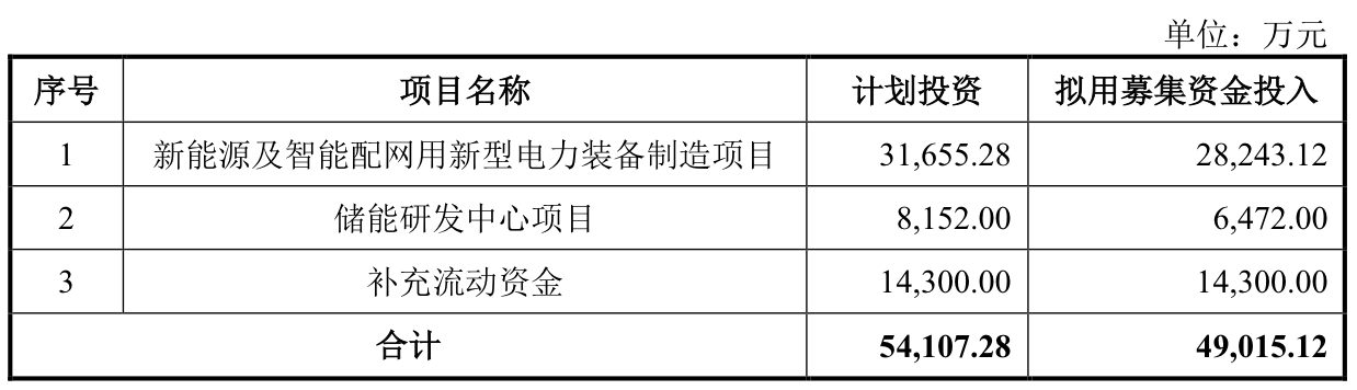 这次计划融资4.9亿元,洛凯股份打算投入到“新能源及智能配网用新型电力装备制造项目”2.82亿元,“储能研发中心项目”6472万元,并且“补充流动资金”1.43亿元。