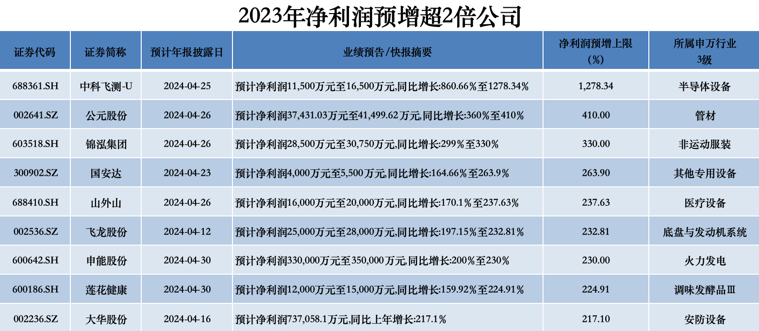 具体来看,业绩预喜个股中,有25家公司2023年归母净利润(上限)预计翻倍增长,其中9家预计增长超2倍。增幅榜前三来看,中科飞测(688361.SH)以最高12.8倍的业绩预期增速暂居首位,公元股份(002641.SZ)、锦泓集团(603518.SH)业绩预期增速也分别高达4.1倍、3.3倍。