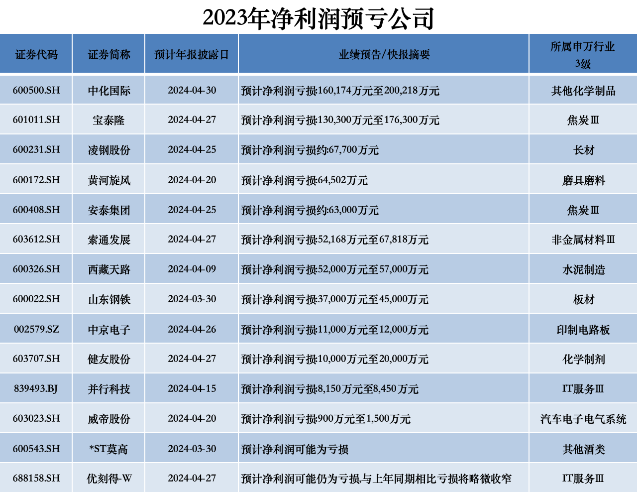 不过也有部分公司业绩表现不佳。14家公司预计2023年净利润亏损,其中7家公司中化国际(600500.SH)、宝泰隆(601011.SH)、凌钢股份(600231.SH)、黄河旋风(600172.SH)、安泰集团(600408.SH)、索通发展(603612.SH)、西藏天路(600326.SH)预计净利润亏损至少超5亿元。