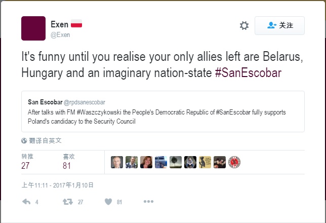 比如有一个自称为“圣埃斯科巴人民民主共和国”的账号称,圣埃斯科巴尔“完全支持波兰成为安理会非常任理事国”,甚至还振振有词地抗议,圣基茨和尼维斯是在干涉该国与波兰的关系。当然,这个账号并没有获得Twitter的官方认证。