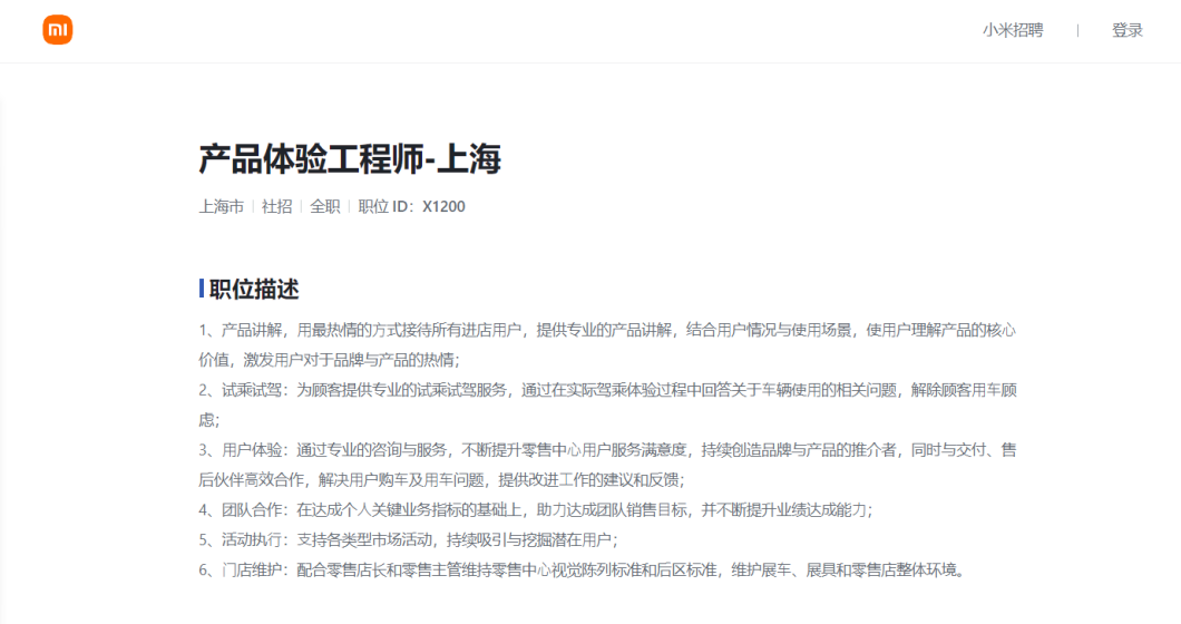 刚参加过小米汽车销售职位面试的苏苏告诉《IT时报》记者,在小米发来的面试邀请上,写的并不是销售岗位,而是换成了“产品体验工程师”,“但我研究了一下职位要求,就是门店销售一职,小米换了个好听的名字。”