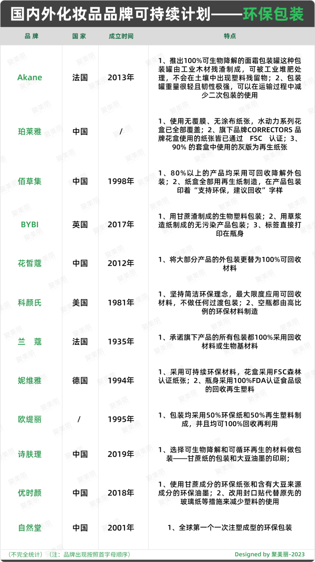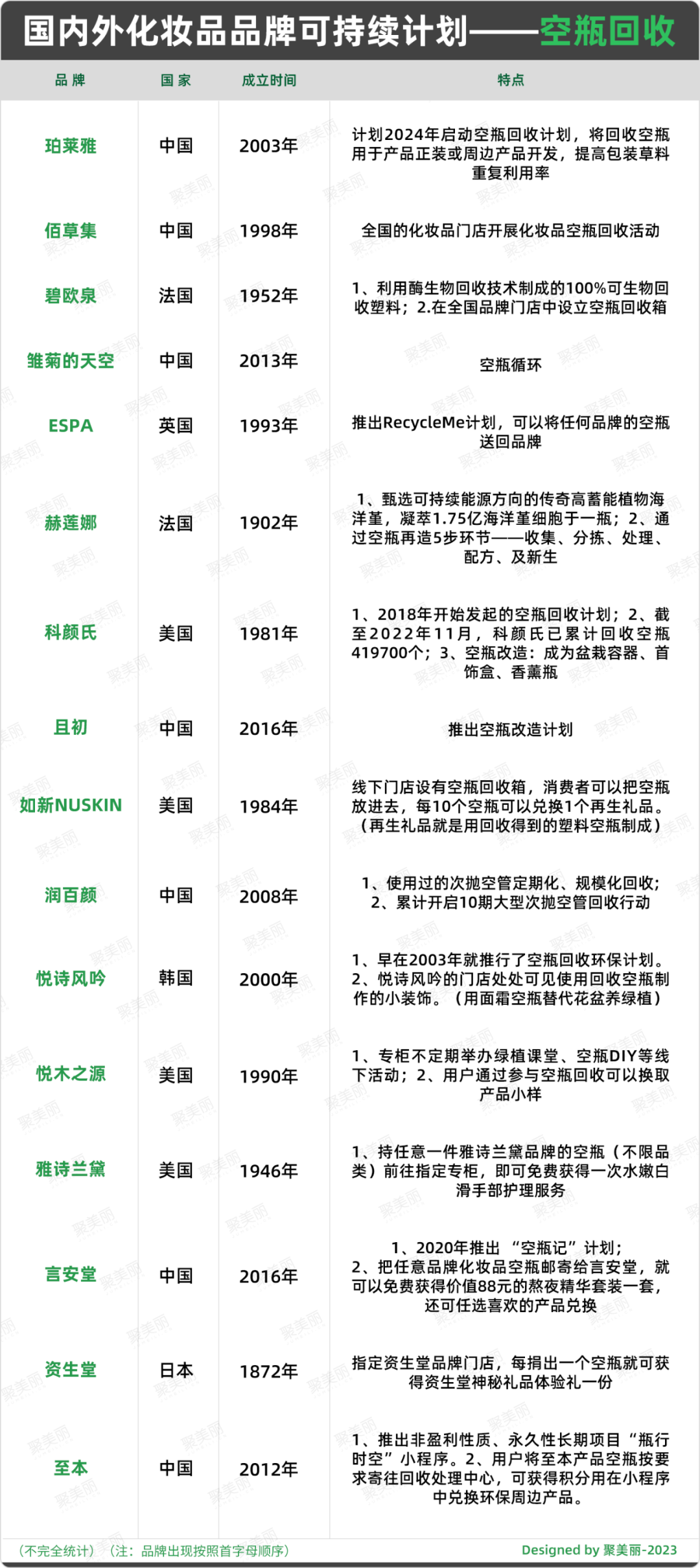 聚美丽发现,在可持续发展的行动中,产品包装是大多品牌会切入的点,如,国内外不少品牌都推出空瓶回收计划、环保包装、替换装等。