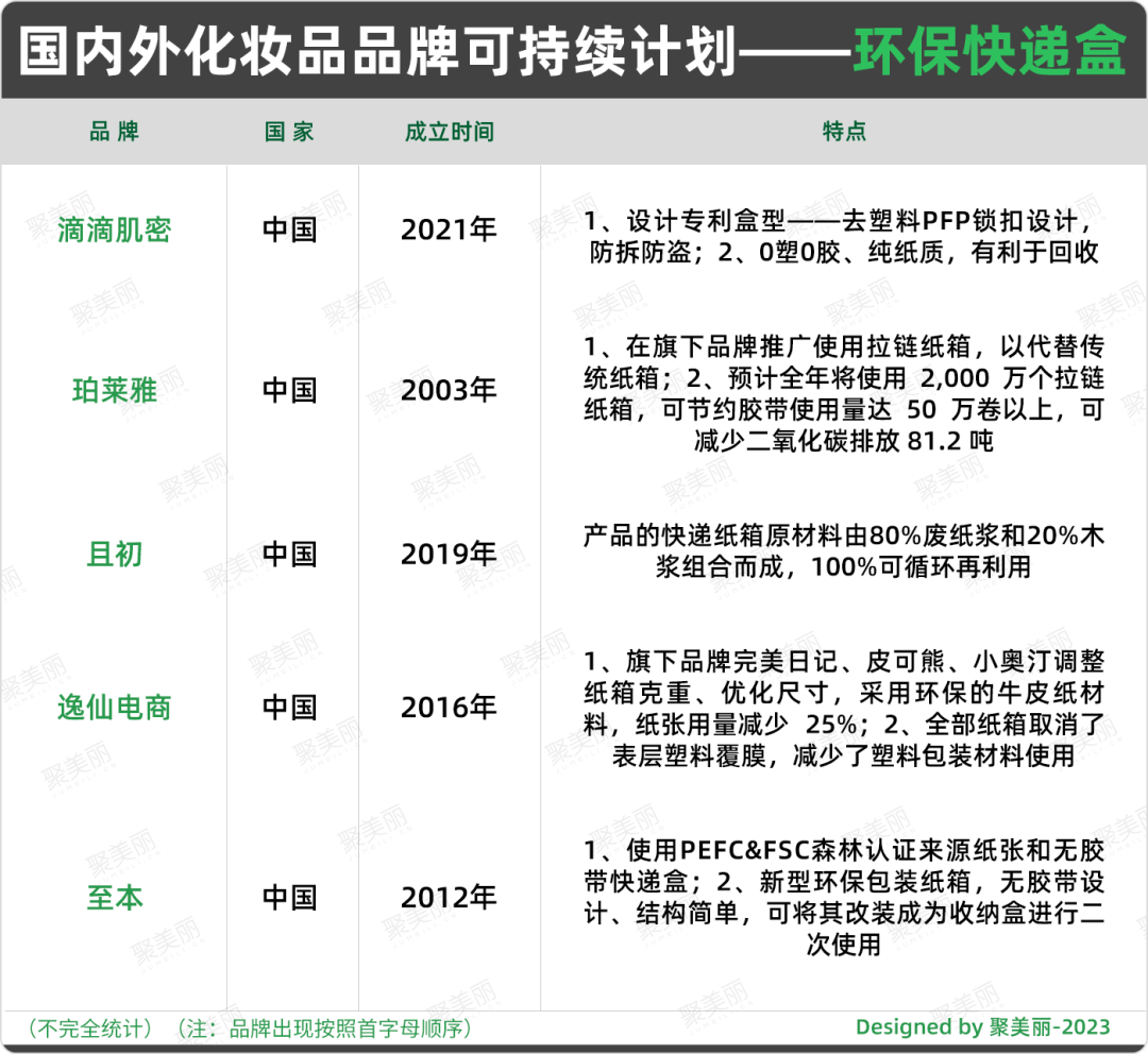 不仅如此,化妆品的可持续包装的多元化还延续到了快递物流端。在国内化妆品品牌中,包含且初、滴滴肌密、至本、完美日记、珀莱雅等在内,都在环保快递盒上有所举动。