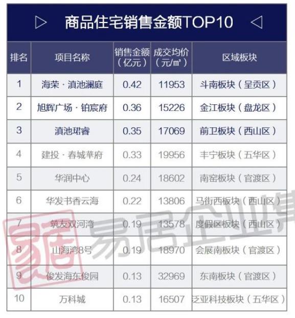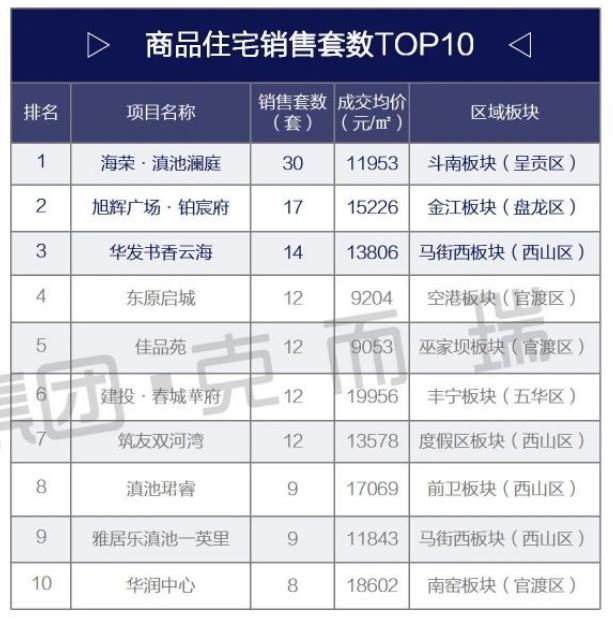 商品房住宅销售套数TOP10中,东原启城、佳品苑、海荣·滇池澜庭、雅居乐滇池一英里4个低价楼盘销售套数都不错,合计成交63套。东原启城、佳品苑两个项目成交单价不到万元,分别为9204元/㎡、9053元/㎡。
