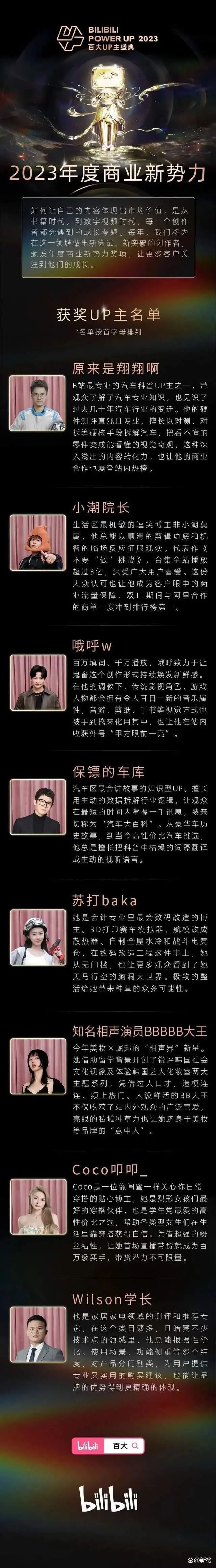 而在2023年的各大奖项中,除了@影视飓风拿下“年度最高人气奖”,@棋手战鹰获得“直播年度黑马”等常规奖项之外,B站还首次设立了“年度商业影响力”和“年度商业新势力”奖,“Mr迷瞪”、“小潮院长”等16位UP主出现在这两大获奖名单中。
