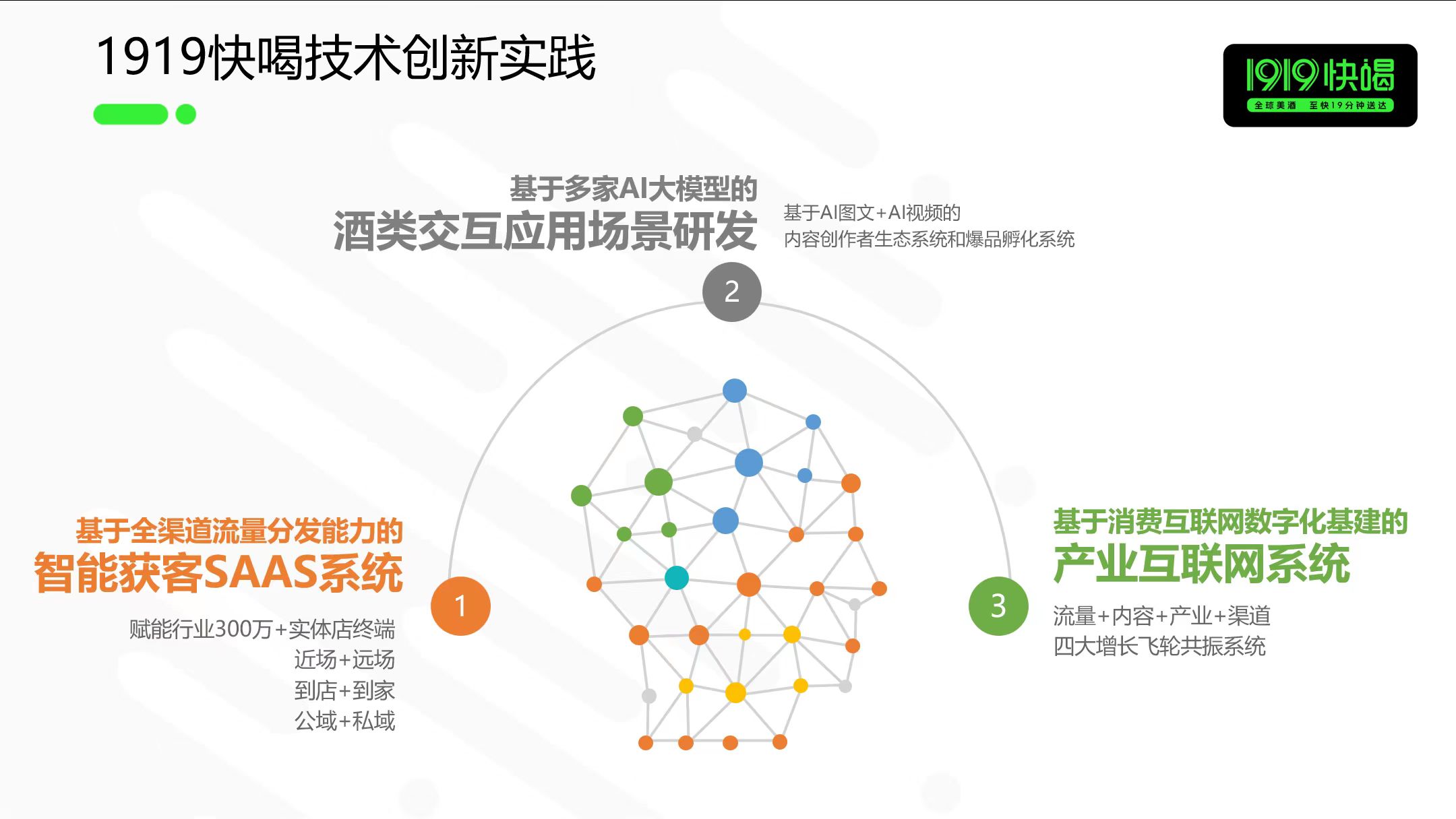 以1919快喝为例,除了基于全渠道流量分发能力的智能获客SAAS系统之外,还开展了酒类交互应用场景研发、产业互联网系统方面的技术创新。基于AI图文和AI视频的内容创业者生态系统和爆品孵化系统,在短时间内智能生成批量酒类高质量图文/短视频,通过虚拟店主主播开展24小时365天“全时化、智能化”直播,并通过同城本地流量进行精准推送。最终打造“流量+内容+产业+渠道”四大增长飞轮共振系统,以外部合作制,无边界组织,实现更极致的整合,以生态做杠杆,撬动更大的市场规模。