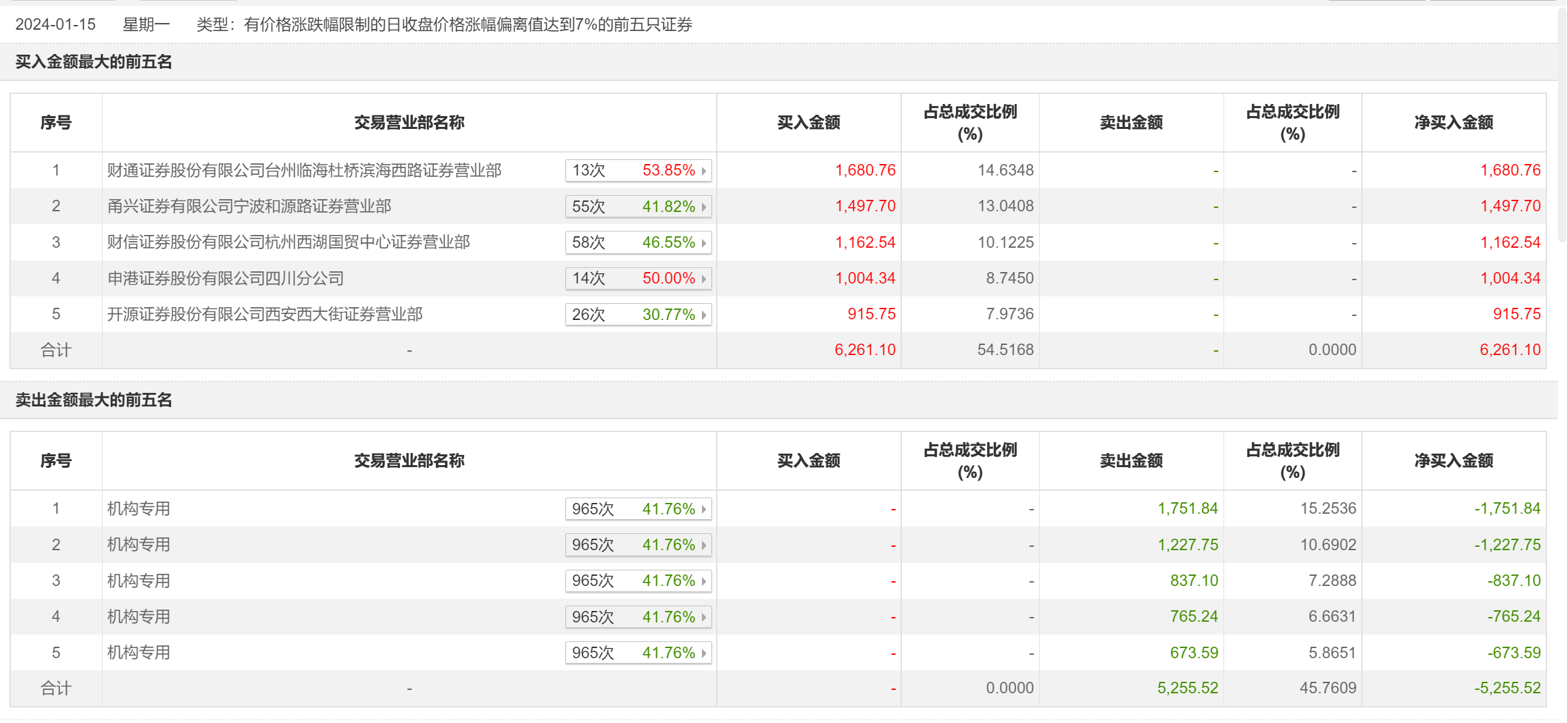 1月15日,锦泓集团今日涨停,全天换手率达2.96%,振幅达0%。龙虎榜数据显示,营业部席位合计净买入1005.59万元。其中,机构合计净卖出5255.52万元。此外,财通证券台州临海杜桥滨海西路证券营业部、甬兴证券有限公司宁波和源路证券营业部分别买入1680.76万元、1497.70万元。