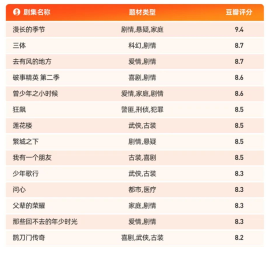 从表现看,按照评分从高到低,由腾讯视频出品的《漫长的季节》拿下最高分9.4分,其次为由腾讯视频出品的《三体》和芒果tv出品的《有风的地方》,均斩获第二高的8.7分;爱奇艺的《破事精英 第二季》和爱奇艺、腾讯视频联合出品的《曾少年小时候》,并列为“探花”8.5分。