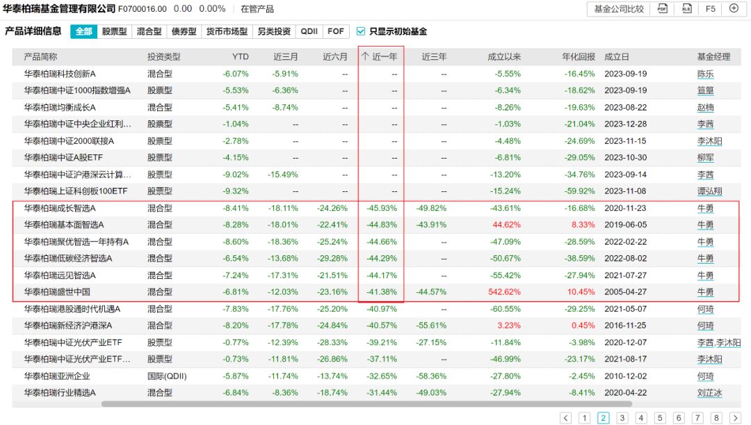 据Wind数据,牛勇近一年管理的全部基金亏损均超40%,其中亏损最大的是华泰柏瑞成长智选A,近一年收益率为-45.93%。其余5只分别是,华泰柏瑞基本面智选A、华泰柏瑞聚优智选一年持有A、华泰柏瑞低碳经济智选A、华泰柏瑞远见智选A、华泰柏瑞盛世中国。