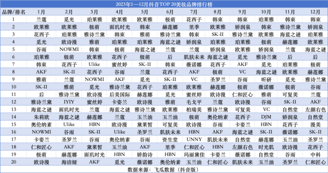 通过对“2023年1—12月抖音TOP 20美妆品牌排行榜”进行分析,仪美尚发现了以下几个特点: