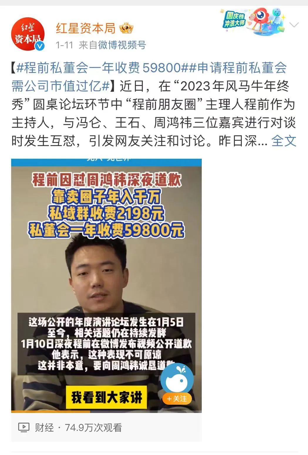 据红星新闻报道,想要学习程前的商业课程,得购买社区年度会员,这个为知识付费的价格是2198元一年。至于程前的私董会每年收取的费用是一人59800元/年,私董会的入门门槛,还得是企业创始人、CEO、投资人等,并要求企业规模1000万以上或者市值过亿。