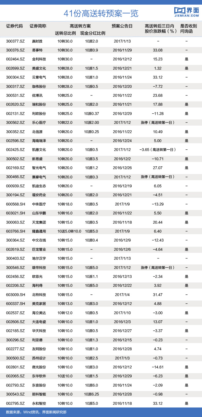 界面新闻统计发现,在已经披露高送转预案的41家上市公司中,19家公司收到监管层的问询,数量占近一半。这其中,对于送转比例与公司本身业绩成长性是否匹配、未来6个月内是否存在大股东及董监高减持计划等成为重点问询的内容。例如,海立美达(002537.SZ)1月9日公布的高送转预案公告里未披露其2016年度业绩预告,深交所便于1月11日发出关注函,要求海立美达结合双主业发展前景、经营模式和报告期内收入及净利润增长率等相关业绩数据,补充说明其利润分配预案与公司的业绩成长性是否相匹配。而早前,新易盛(300502.SZ)“10转20派3.5元”的高送转预案也遭到深交所问询,其原因便是该公司的董监高未来6个月内密集减持。