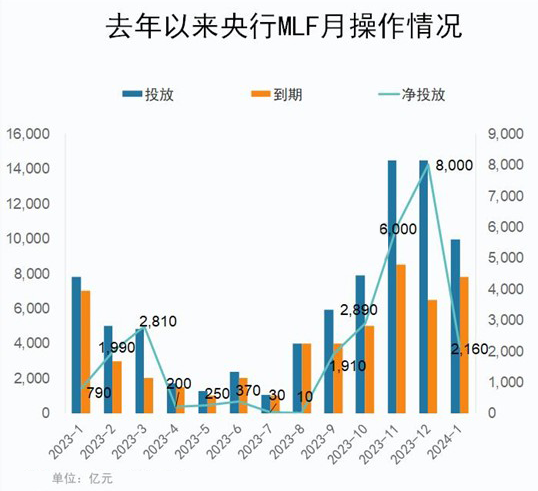 从央行公开市场业务交易公告获悉,2023年11月和12月,央行分别开展1.45万亿元MLF,均进行平价净投放。其中,2023年12月,MLF净投放量达8000亿元,创2023年超额续作净投放量新高。