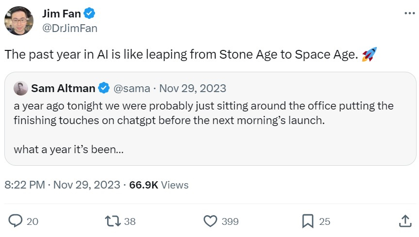 正如上文提到的,人工智能发展中的许多拐点可能即将到来。英伟达首席执行官黄仁勋最近表示,“人工智能可能在五年内实现,它可以在各种任务中达到人类水平。”英伟达高级研究科学家兼人工智能代理负责人 Jim Fan 则补充道:“过去一年的人工智能发展就像是从石器时代跨越到了太空时代。”