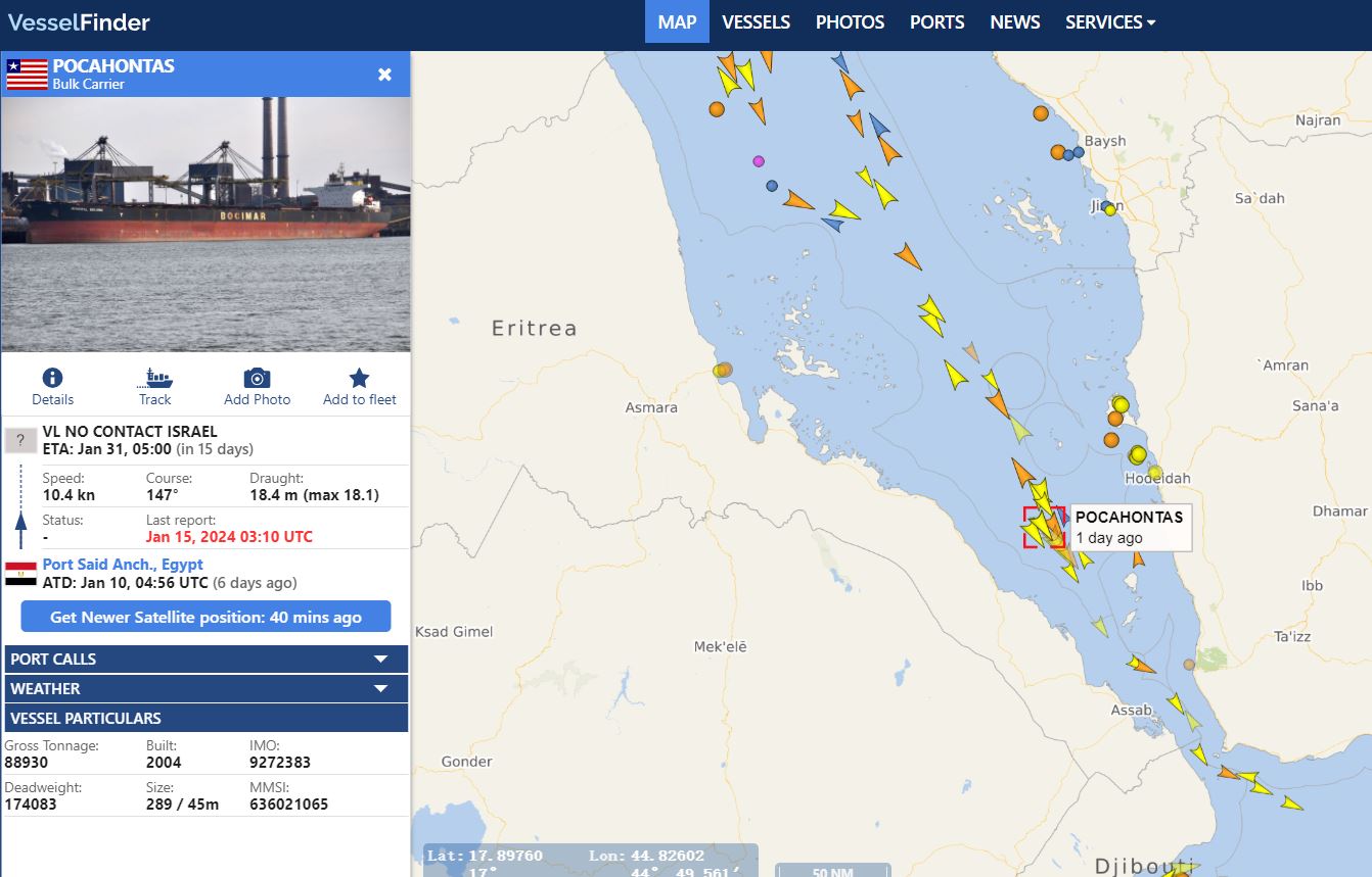 船舶追踪网站Vessel Finder的数据显示,目前正在准备通过红海南部的商船在目的地一栏进行了特殊标注。从埃及出发的散货船POCAHONTAS号在目的地一栏特别标注:与以色列无关。