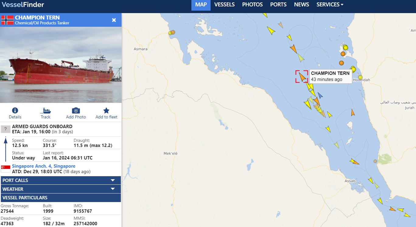 从新加坡出发的化学品运输船CHAMPION TERN则在目的地一栏明显标出:船上有武装安保。