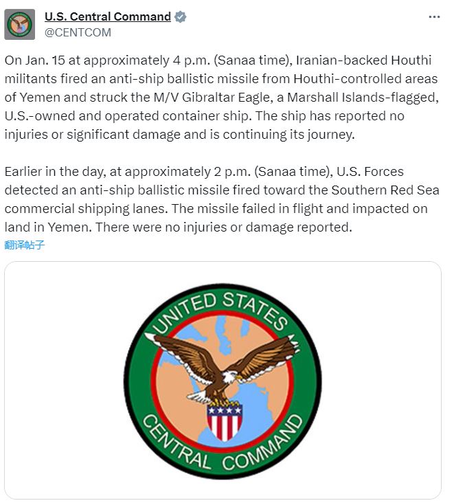 导弹击中集装箱船,但没有造成严重损坏,也没有人员伤亡。当天早些时候,美军监测到胡塞武装向红海商船航道发射了另一枚反舰导弹,但导弹在途中坠毁,落在也门境内。