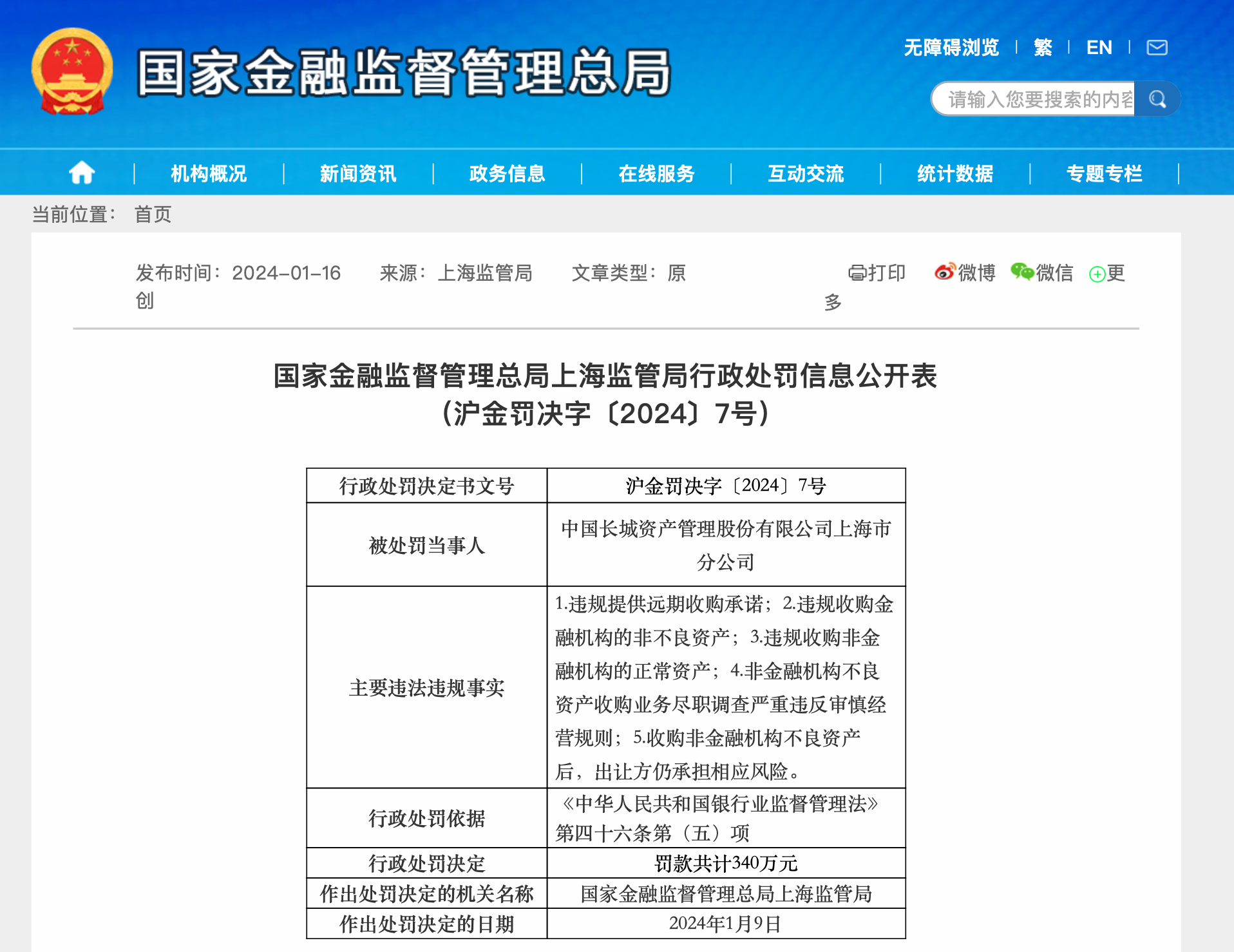 1月16日,国家金融监督管理总局上海监管局行政处罚信息公开表显示,中国长城资产管理股份有限公司上海市分公司因5项主要违法违规事实被罚款共计340万元。具体包括:违规提供远期收购承诺;违规收购金融机构的非不良资产;违规收购非金融机构的正常资产;非金融机构不良资产收购业务尽职调查严重违反审慎经营规则;收购非金融机构不良资产后,出让方仍承担相应风险。