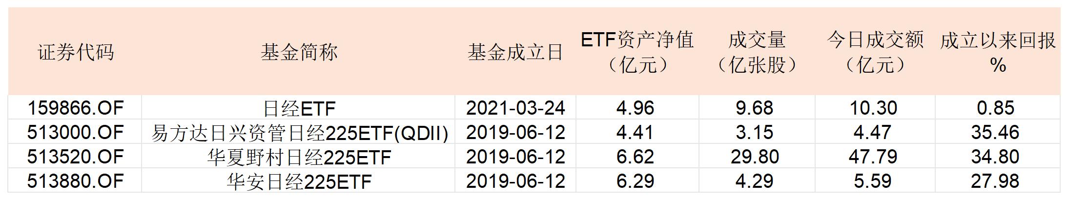 以日经225ETF为例,截至今日收盘,目前市面上共有四只相关产品,其中净值规模最大的是华夏野村日经225ETF。Wind数据显示,1月16日,华夏野村日经225ETF的成交量为29.8亿股,成交额高达到47.79亿元。