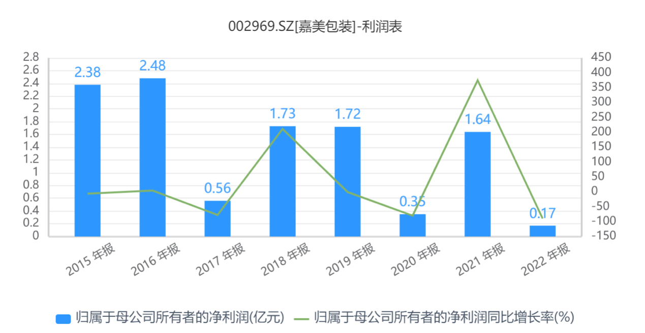 从预告净利润上限来看,嘉美包装2023年1.73亿元的净利润,为自2019年以来盈利最高值,与2018年水平相当。