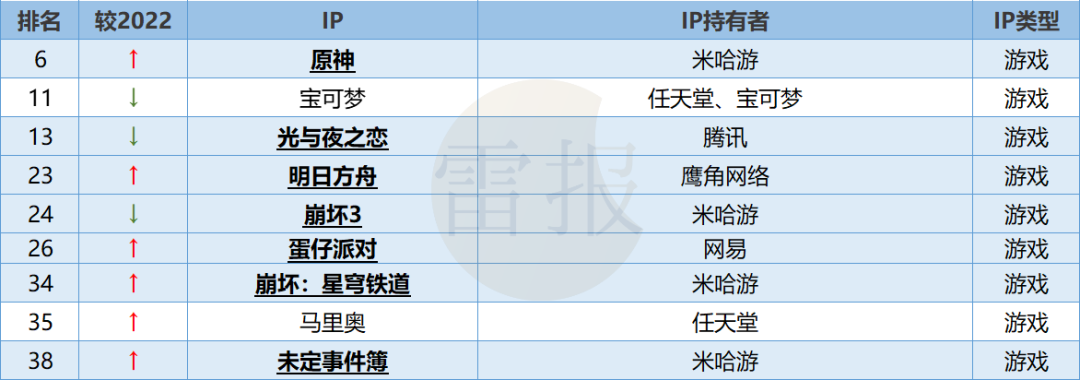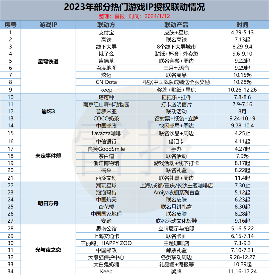 此前,雷报也曾针对游戏IP的跨圈联动玩法进行了详细的分析和报道,榜单中的IP,同样是各大品牌、IP方合作的重点选择对象。可见,游戏IP的商业授权价值十分可观,营销能力也获得了市场的广泛认可。