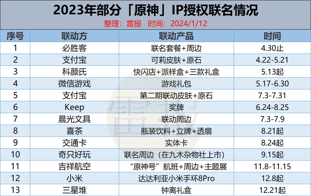 雷报对2023年原神的部分授权联动情况进行了整理。不难看出,原神IP选择的授权联动对象范围已经越来越广泛,同时,实体产业占据主流。在合作方式上,原神主要围绕合作品牌进行定制,将游戏内容融入实体店铺、实体产品中。
