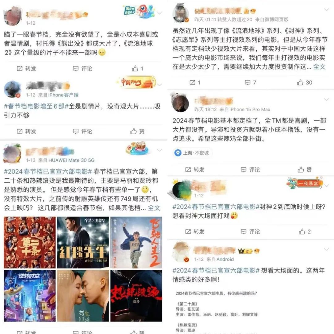 在微博热搜话题#春节档已定档6部影片#下,欢欣雀跃的期待与兴致缺缺的观望并存,甚至有部分观众直言“今年的春季档好像春晚一样难看无聊”。