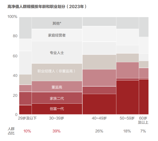 2020年前后,黄金一代开始逐步退休,80后则迈入中年。1960-1970出生这一代人,被称为黄金一代,在2010年左右成为社会发展和经济增长的中坚力量,伴随着中国经济的高速增长,以及环境改善、治安优化、公共医疗水平提升等因素,无论是身体状况或财富积累,都有着比以前老人更好的条件。招商银行发布的《2023中国私人财富报告》显示,高净值人群中51%以上为40岁及以上人群,90%以上为30岁及以上人群。