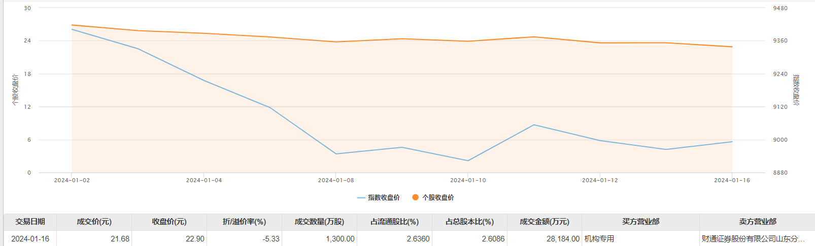 鸿博股份1月16日大宗交易成交1300万股,成交额2.82亿元,占当日总成交额的23.81%,成交价21.68元,较市场收盘价折价5.33%。