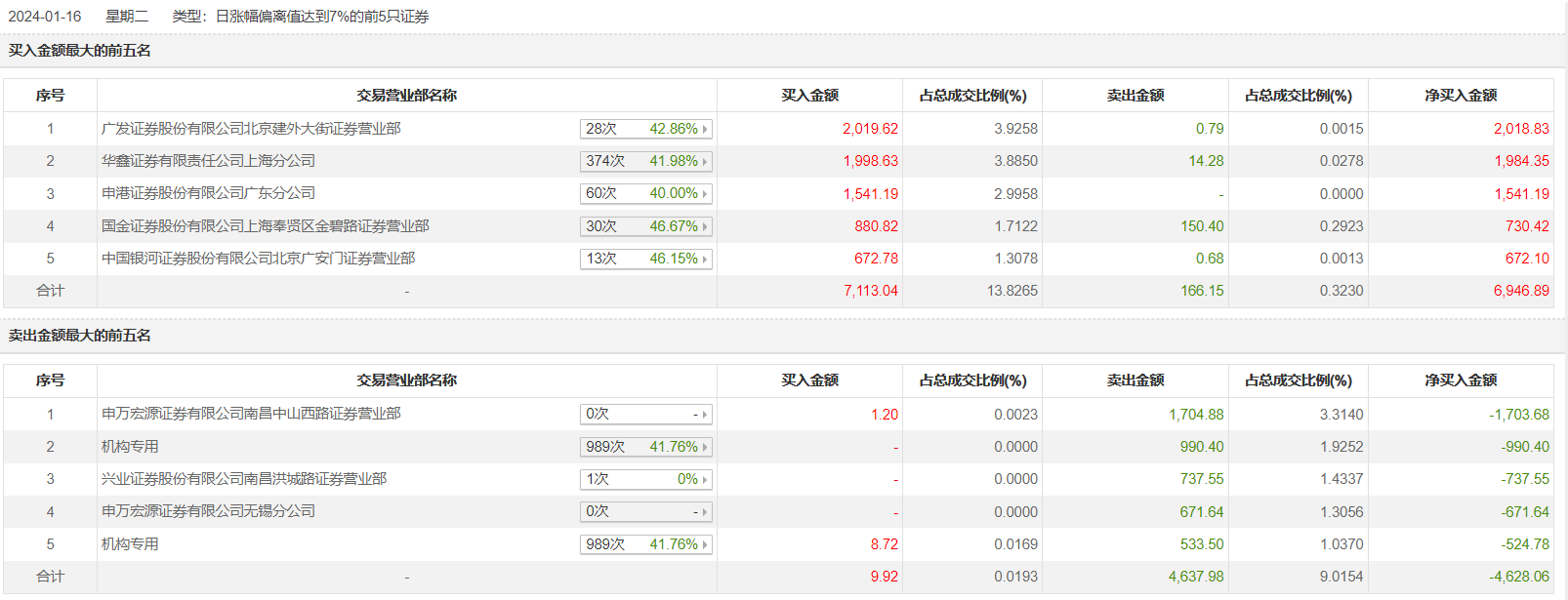 凯恩股份1月16日涨停,全天换手率达18.07%,振幅达11.19%。龙虎榜数据显示,营业部席位合计净买入2318.83万元。其中,机构买入8.72万元,卖出1523.9万元,合计净卖出1515.18万元。此外,广发证券北京建外大街证券营业部、华鑫证券上海分公司分别买入2019.62万元、1998.63万元;申万宏源证券有限公司南昌中山西路证券营业部、兴业证券南昌洪城路证券营业部分别卖出1704.88万元、737.55万元。