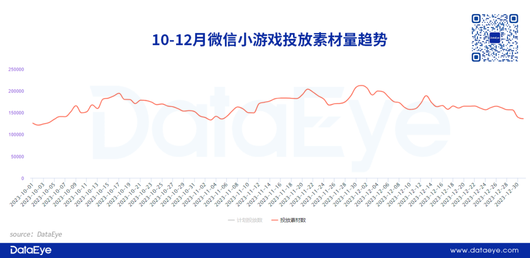 总素材量方面,12月微信小游戏日均投放素材投放量接近17万组,微信小游戏素材投放量维持强势。投放素材量峰值出现在12月1日,单日投放素材超过21万组,但随后在12月出现持续下滑的趋势,2023年最后一天投放素材量仅为13万组。