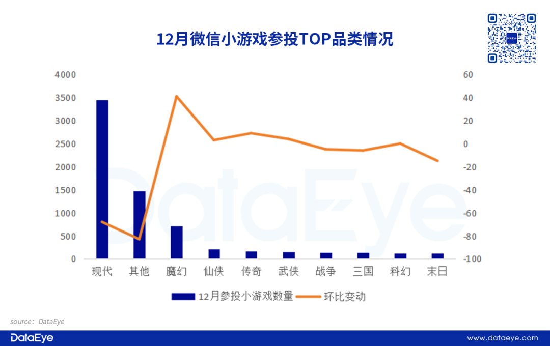 对比11月,12月份中重度题材参投游戏数继续保持上升态势,但整体幅度不算太大。随着微信小游戏产品生态愈发成熟,中重度产品在投产品增多,意味着微信小游戏产品愈发重视产品游戏性和用户留存,产品生态品质逐步提升。