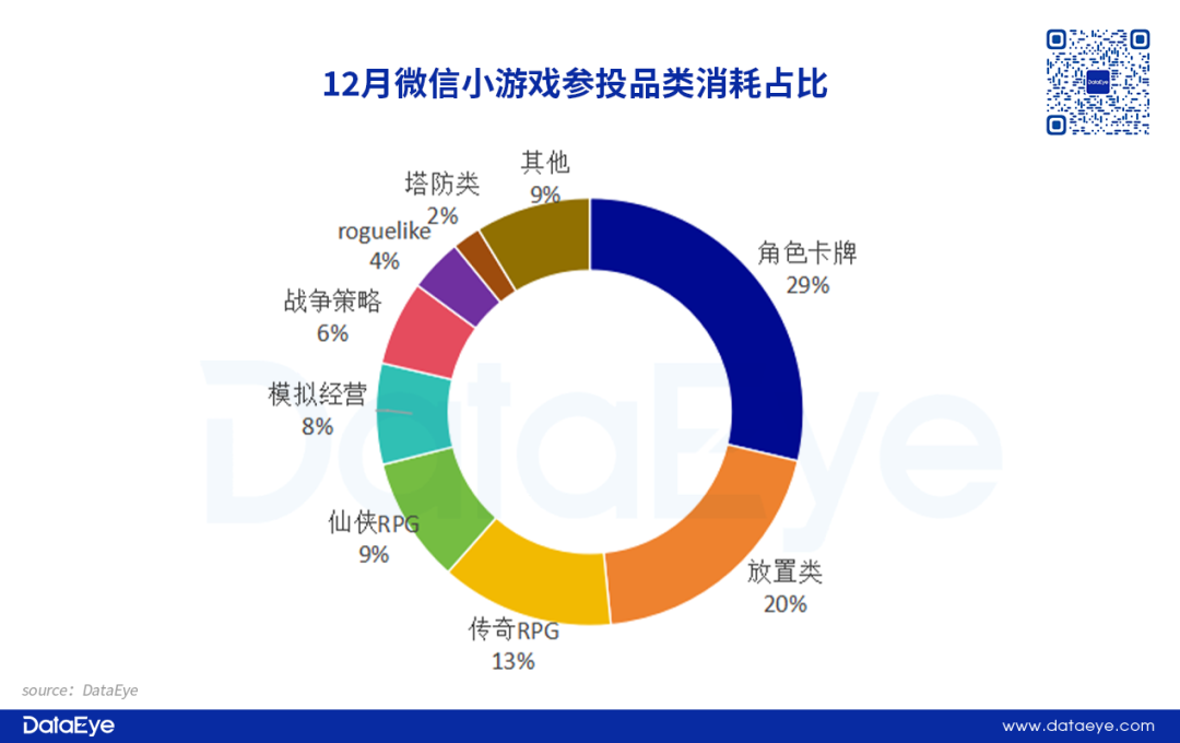 总体而言,12月整体消耗格局环比11月变化不大。值得注意的是,12月一些小众品类均有增长,如战争策略上涨了1个百分点,其中主要是三七旗下《霸业》小游戏增加投放明显,而Roguelike和塔防等品类也有提升。