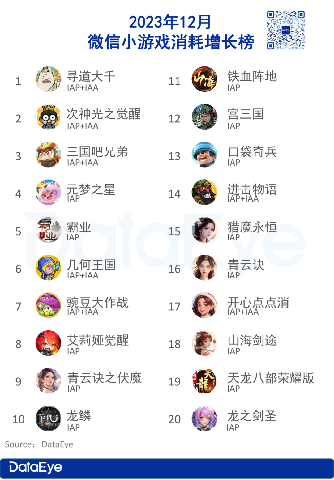 消耗榜肩部:微信小游戏月度消耗榜TOP5-15都是北京、广深厂商的小游戏老面孔。其中,青时《青云诀之伏魔》本月排名继续提升,已经升至第7位。豪腾《肥鹅健身房》《道天录》仍表现强势,但是《疯狂骑士团》已经跌出消耗榜TOP20。消耗榜新星:12月有4款产品首次进入月度消耗榜TOP20,分别是排名11的《豌豆大作战》,排名15的《几何王国》,排名17的《元梦之星》以及排名19的《霸业》,且背后均为上市公司。