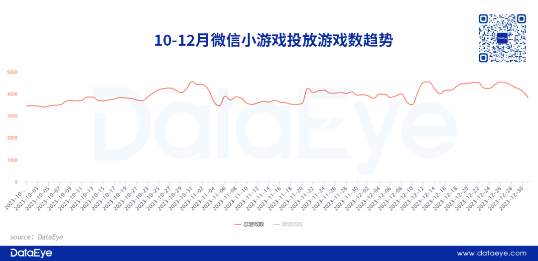 投放游戏数方面,12月日均参与投放的微信小游戏环比有所增长,12月13日在投游戏数达到峰值,单日在投游戏数超过4500款游戏。