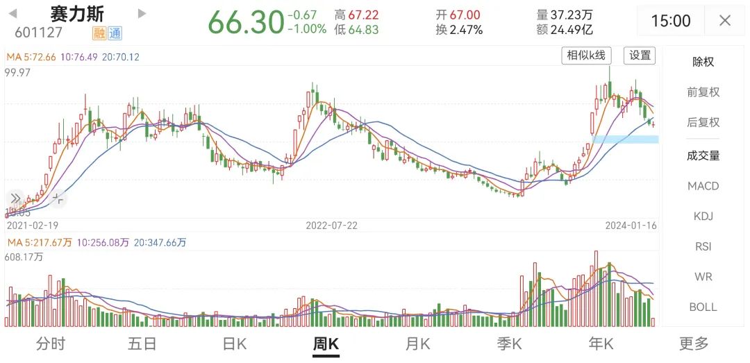 而赛力斯股价的攀升,很大程度上是由于新款问界M7的畅销。新款问界M7自去年9月上市以来不断刷新纪录,发布仅两个半月,大定量就已突破10万台,成为行业现象级事件。在新款M7的持续热销下,赛力斯在资本市场也实现爆发式增长。2023年年内股价最高涨幅达144.81%,一举跻身千亿市值行列,位居中国新能源车企市值第三。