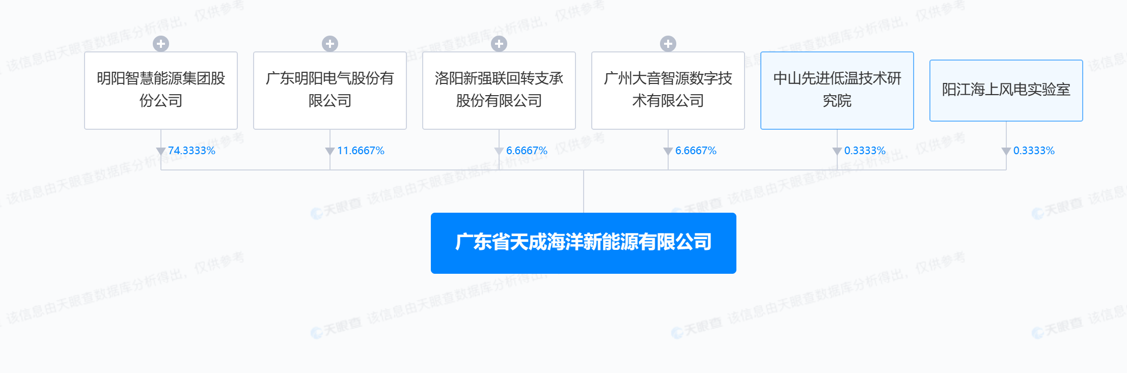 天眼查显示,近日,广东省天成海洋新能源有限公司成立,法定代表人为张启应,注册资本3000万元,经营范围包含:海上风电相关系统研发;光伏设备及元器件制造;新兴能源技术研发;海洋能系统与设备制造等。股权穿透显示,该公司由明阳智能、明阳电气、新强联等共同持股。