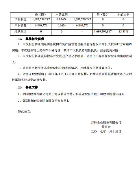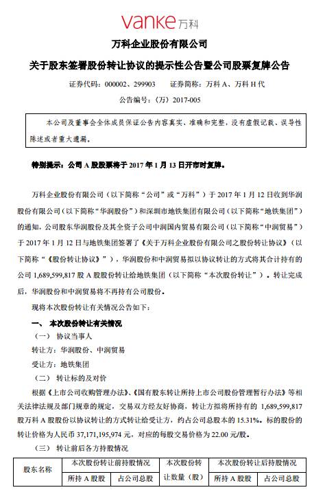 万科晚间公告:收到华润股份有限公司和深圳市地铁集团有限公司的通知,公司股东华润股份及其全资子公司中润国内贸易有限公司于 2017 年 1 月 12 日与地铁集团签署了《关于万科企业股份有限公司之股份转让协议》,华润股份和中润贸易拟以协议转让的方式将其合计持有的公司 1,689,599,817 股 A 股股份转让给地铁集团。
