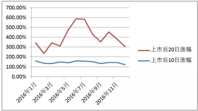 具体来看,2016全年新股上市后10日平均涨幅波动不大,而上市后20日平均涨幅在去年6月、7月达到最高,均逾400%,而开年前几个月和12月涨幅多在200%以下,呈现首尾两端下降的趋势。