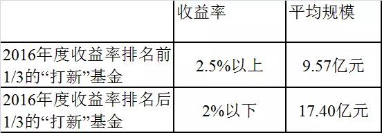12亿及以上规模的“打新策略基金”,能够较充分参与打新,但是打新收益相对基金较大的规模贡献甚微,债券资产将决定基金的风险收益表现。如以12亿规模为例,2016年全部顶格获配计算,打新贡献收益率约2.3%。