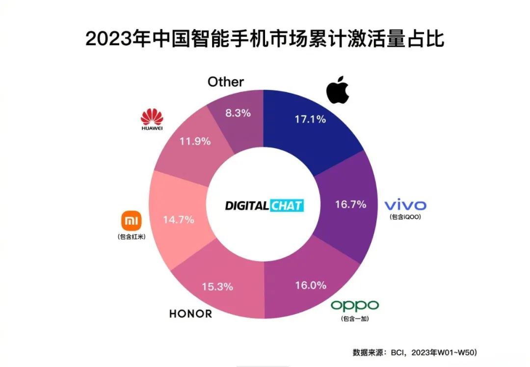 来自CBI以激活量为统计口径的数据显示:iPhone成为了2023年中国智能手机市场销量第一的成绩,vivo、OPPO紧随其后,荣耀、小米、华为分列四五六位,六大智能手机品牌合计占据了国内整体智能手机市场91.7的市场份额。