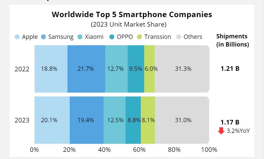 另一方面则是苹果和三星在高端市场的份额,被国产厂商进一步蚕食——数据显示:苹果在高端智能手机市场份额从从2022年的75%下跌至71%,三星在高端市场份额也下跌了1%。与此同时,华为在高端市场份额则提升了2%,小米在高端市场份额也提升了1%。