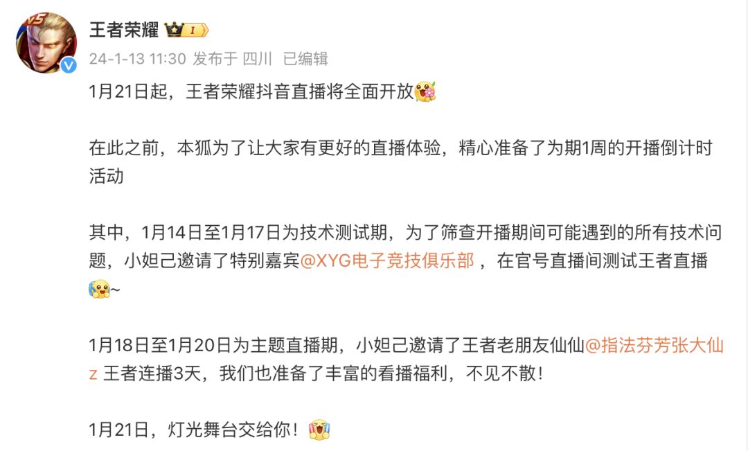为筛查开播期间可能遇到的所有技术问题,1月14日至1月17日为技术测试期,著名王者荣耀主播张大仙及其XYG战队现身王者荣耀抖音官方账号的直播间,并直播打《王者荣耀》。
