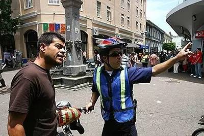 ▲一名骑自行车的哥斯达黎加警察在步行街上接受市民咨询。
