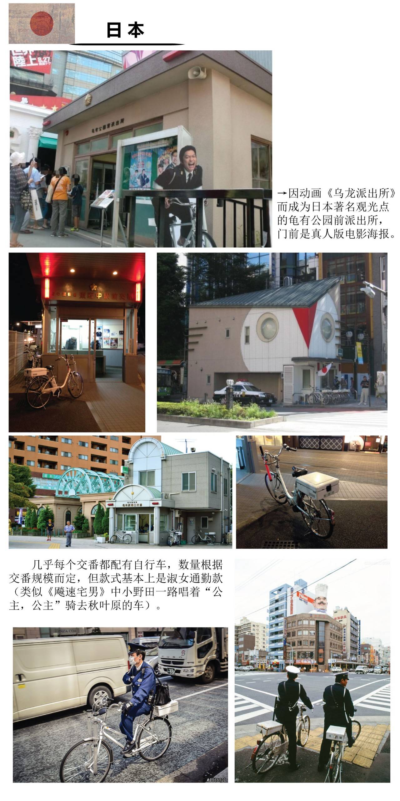 日本交番(类似我国的派出所)随处可见,一般设施简陋,绝大多数在此工作的警察都是骑着专门的自行车出去巡逻或处理事件。