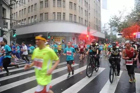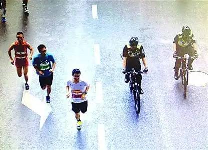 2014年上海国际马拉松比赛现场,出现了首支自行车武装骑警,护卫上马安全进行。