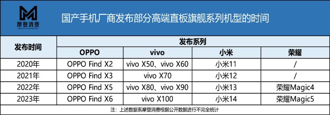 据「摩登消费」不完全统计,上述国产厂商自首款高端直板旗舰机发布后,几乎均保持着“一年一发甚至两发”的节奏。