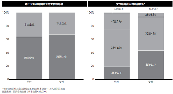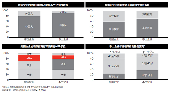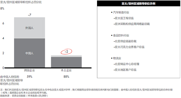 目前在华经营的跨国公司中,近60%的亚太/亚洲区域领导职务由中国人担任。随着越来越多的本土人才开始在外企中担任总监级职务,跨国公司中针对中国人的“玻璃天花板”似乎正在逐渐被打破。许多跨国公司的全球职位同样也向全球英才开放,这可能会继续吸引中国众多具有全球视野和雄心壮志的领导者;同时,中国本土企业愈加成熟老练,可以预期曾在这些公司得到锻炼的中国领导者将在本土企业和国家企业中承担更多责任。在本土企业中,近90%的亚太/亚洲区域领导职务都由中国人担任。
