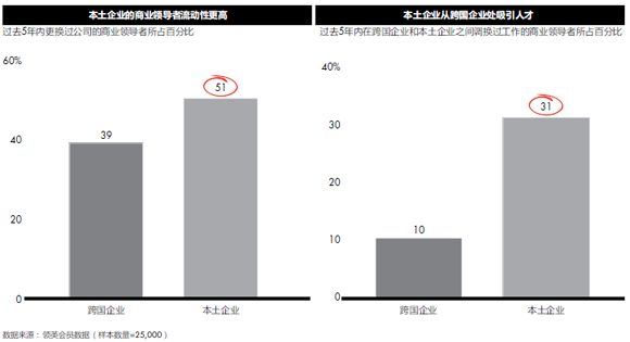 越来越多中国企业领导人才倾向于放弃在跨国公司追求可预见的职业晋升路径,而选择就职本土公司。过去五年来,只有10%的跨国企业领导者来自本土企业,而本土企业领导者中却有近三分之一曾就职于跨国企业。