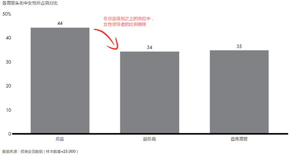 值得注意的是,在中国的新一代商业领导人中,女性领导人占据了重要地位。数据显示,有40% 的中国企业领导者为女性,而在 35 岁以下的领导者中,男女数量几乎相等。虽然男性人数在总监、副总裁及CEO三个高管级别都占了上风,但两性总监的比例大致接近(女性占44%)。
